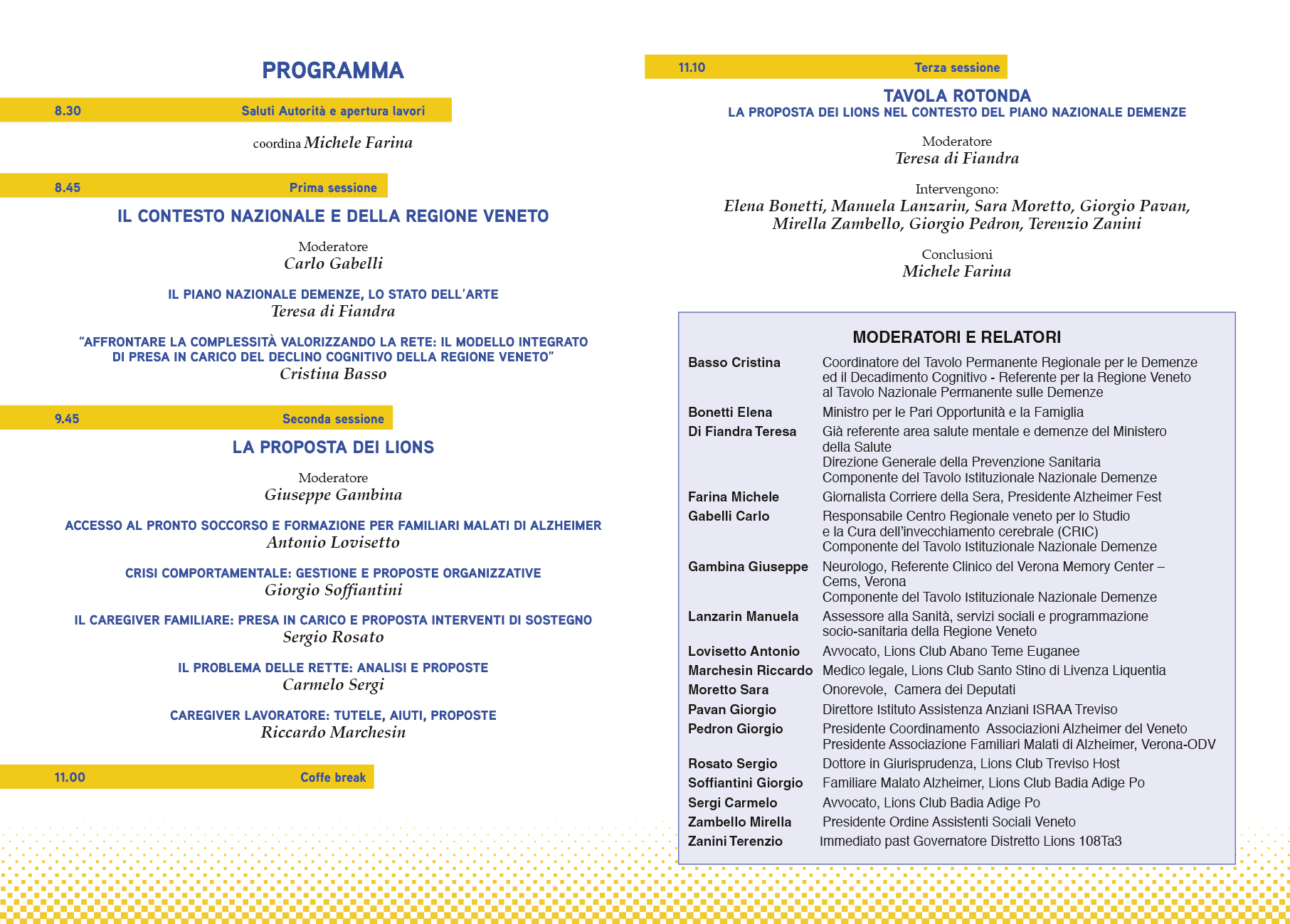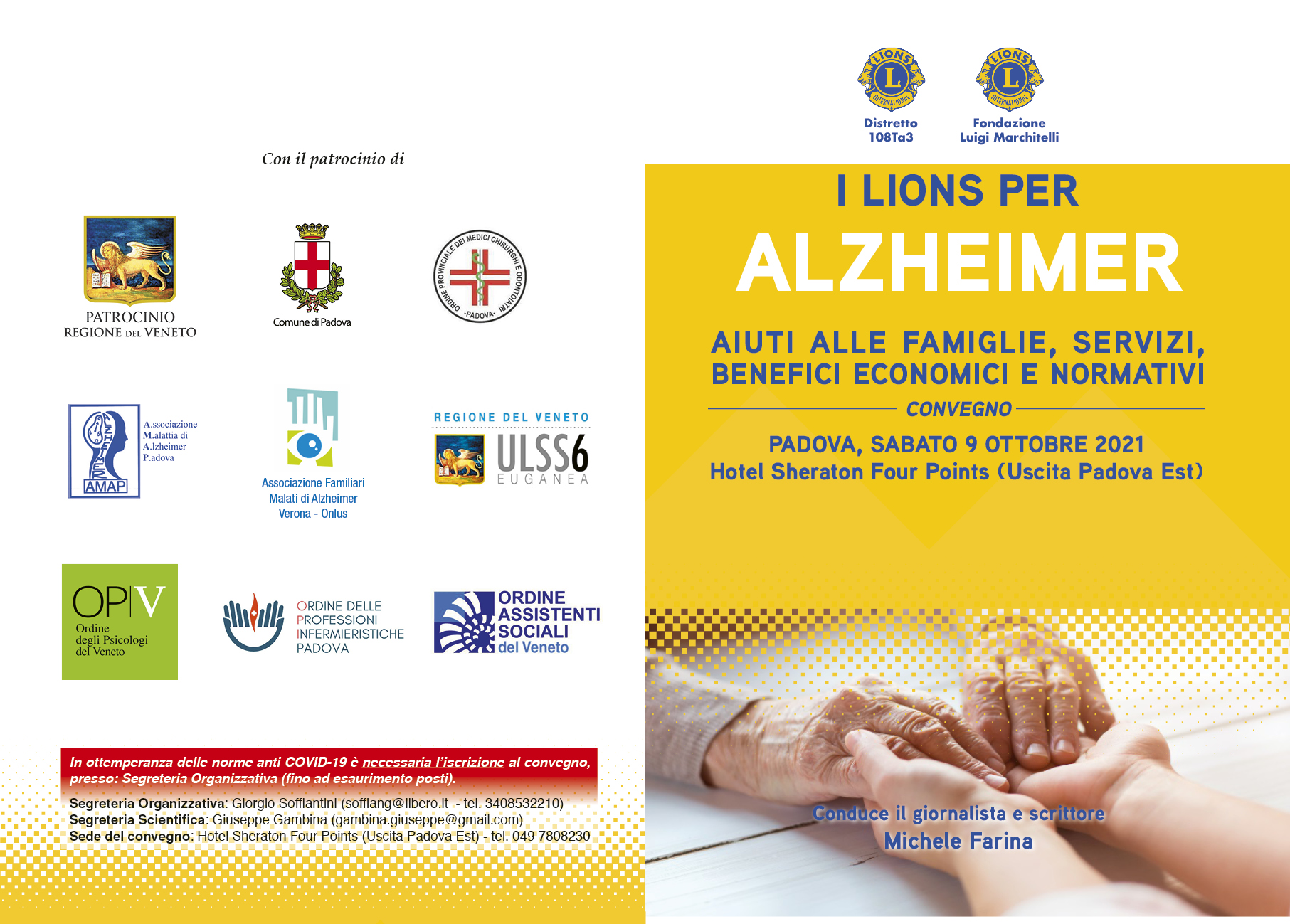 Sabato 9 ottobre dalle 8.30 all'hotel Sheraton di Padova è in programma il convegno sul tema "Alzheimer - Aiuti alle famiglie, servizi, benefici economici e normativi". Per le preiscrizioni: Questo indirizzo email è protetto dagli spambots. È necessario abilitare JavaScript per vederlo., 340 8532210. Per visionare da remoto, il sito è https://www.youtube.com/user/Lions108ta3TV